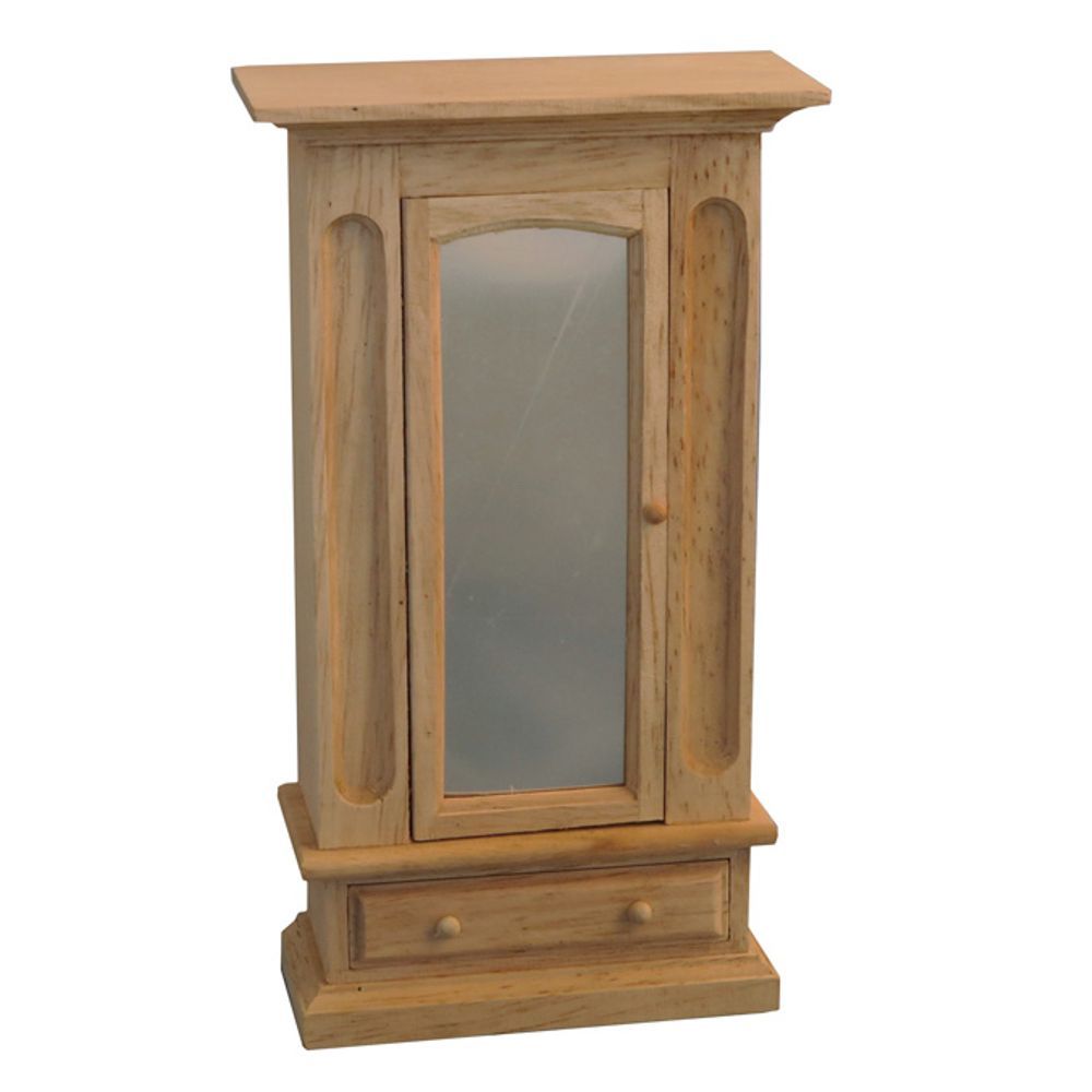 Natural unfinished wood wardrobe cupboard for 1:12 scale dolls house. Opening doors with shelved interior. Includes brass coloured knobs. Can be stained, varnished, waxed, painted or left natural.