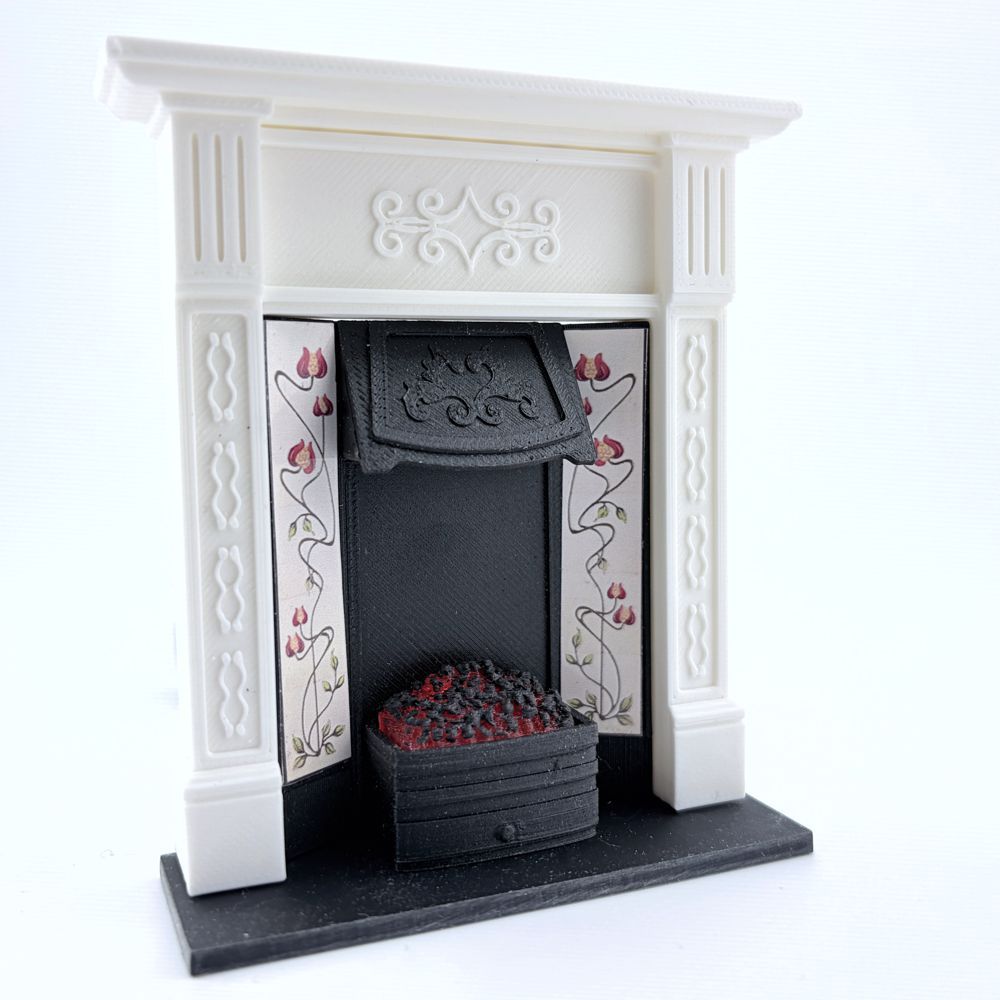 Dolls house fireplace with realistic flickering glowing coal fire.
