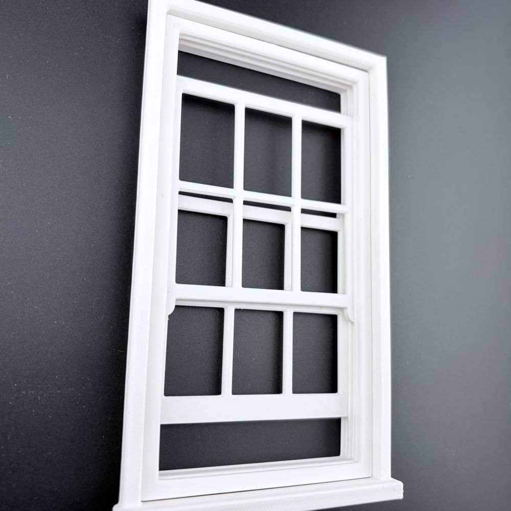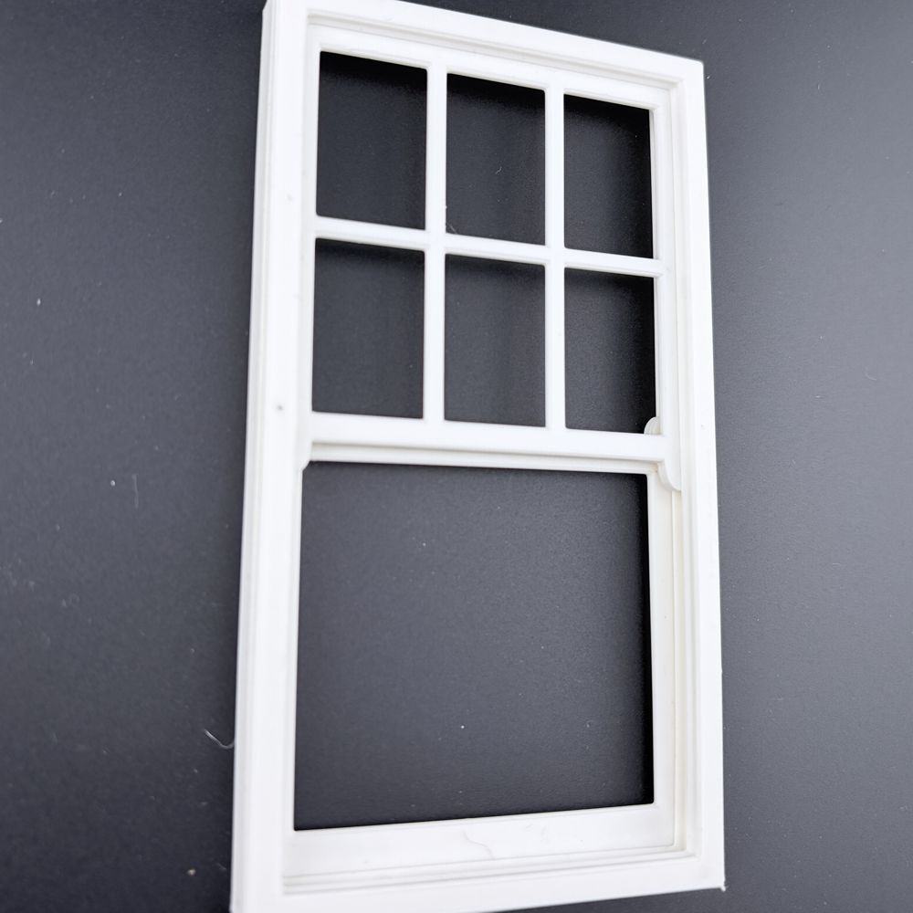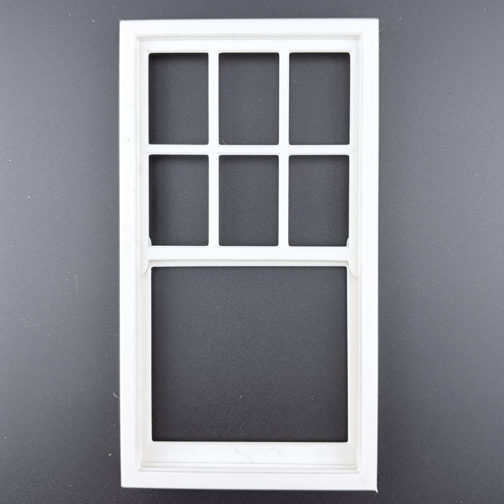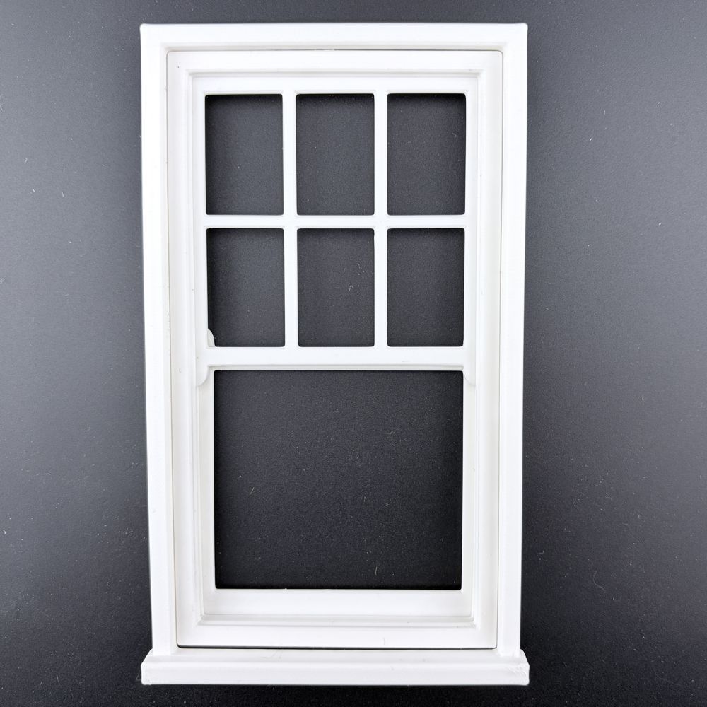 White dolls house sash window frame with opening windows.