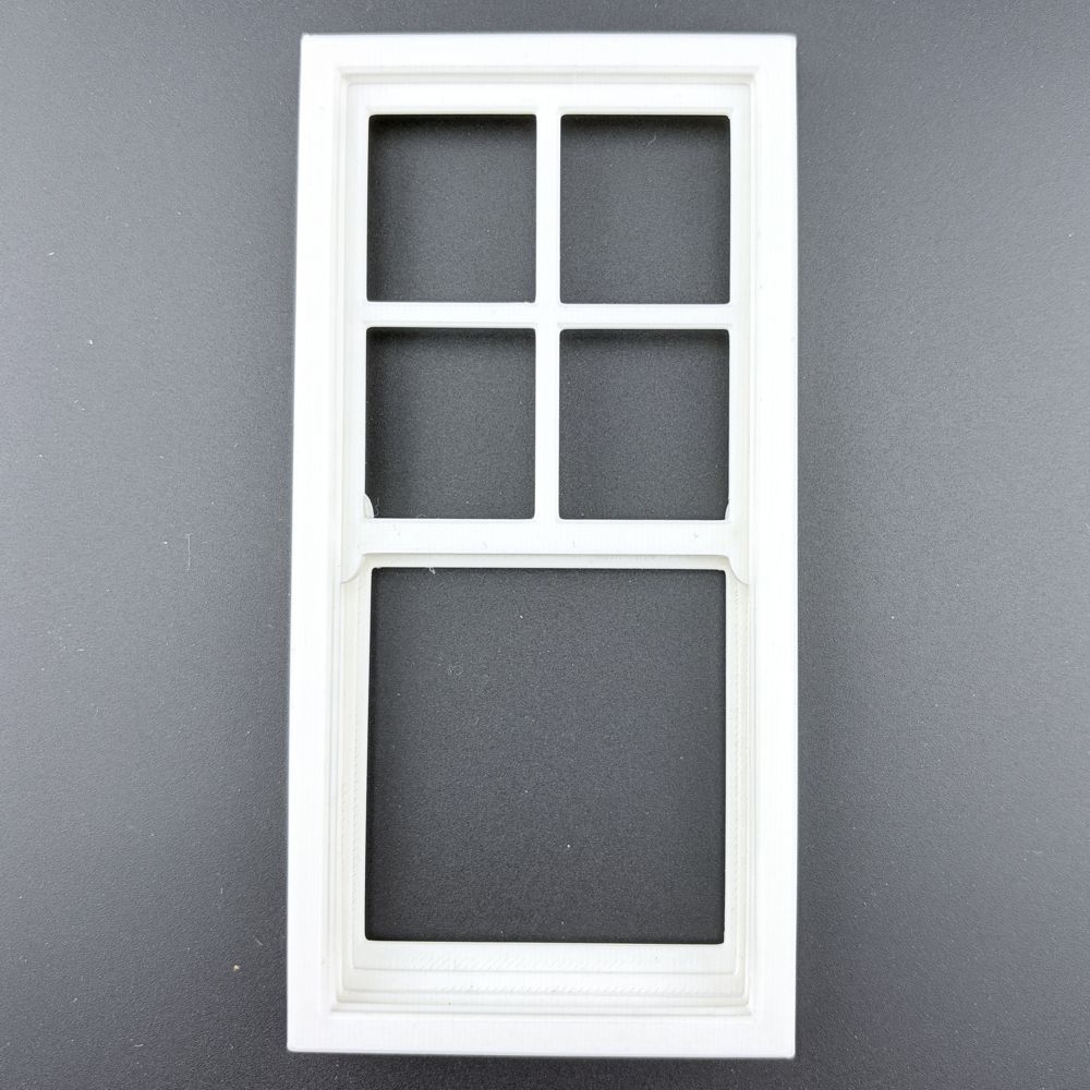 White dolls house sash window frame with opening windows.