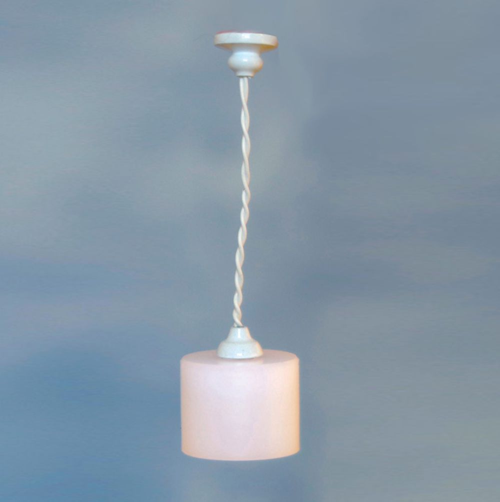 White cylinder shade ceiling light. Includes replaceable bulb, wire and plug.