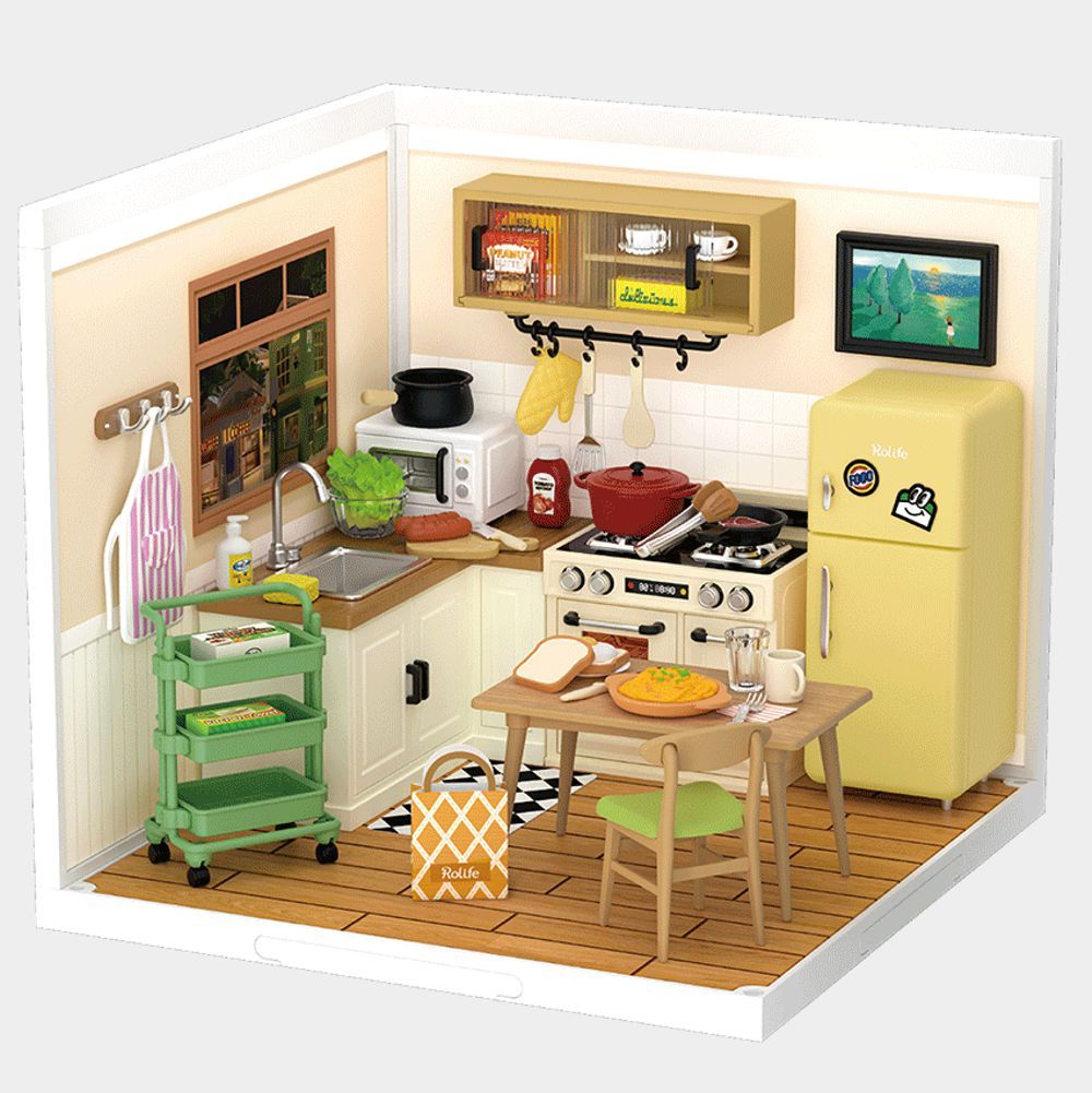 Build a simple, cozy cooking area with the Rolife Happy Meal Kitten miniature kit. The kit has realistic appliances and props for an easy and enjoyable building experience.